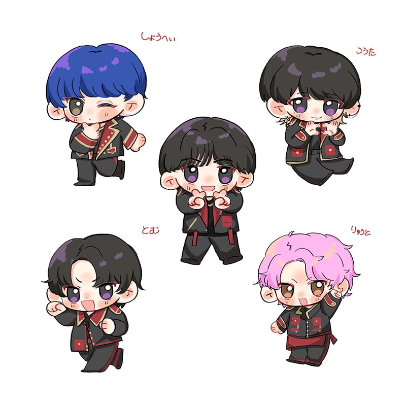 1stワンマンLIVE初披露の赤黒衣装をまとったメンバーのデフォルメイラストのアクリルキーホルダー。